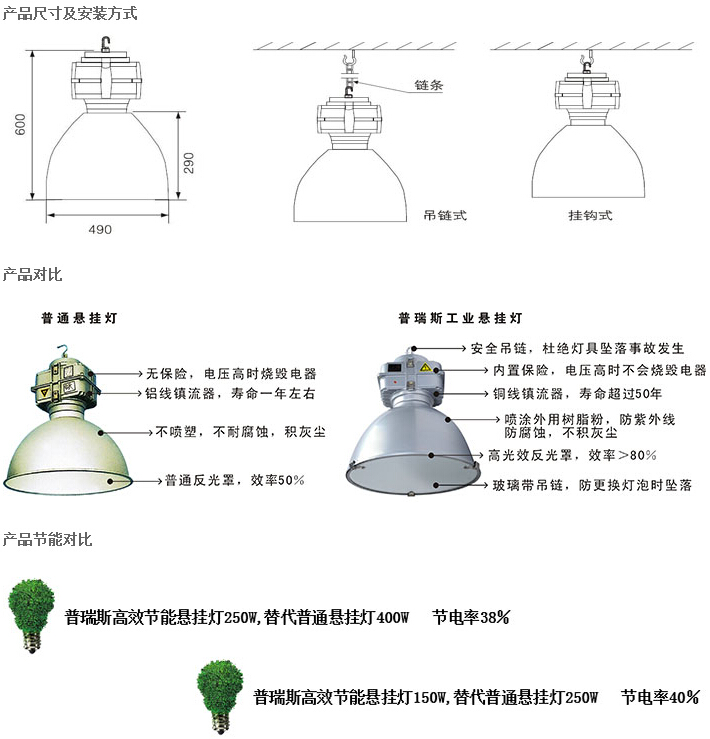 應(yīng)用場所: 工業(yè)廠房、體育場、候車大廳、機場、博物館、商場、市、店鋪、各種專賣店。 電器配置: 》鎮(zhèn)流器:通過CE,CCC認證的帶過熱保護鎮(zhèn)流器,防止光源壽命終結(jié)時產(chǎn)生的整流效應(yīng)而導致意外發(fā)生。 》觸發(fā)器:通過CE,CQC認證的三線串聯(lián)式TC105℃觸發(fā)器。 》電容器:通過CE,CQC,UL認證TCTC105℃的防爆自愈式鋁殼電容器。 可選用智能觸發(fā)器,具有自動檢測和延時關(guān)閉功能,能有效延長光源和電器的壽命,降低維護成本及避免維護時產(chǎn)生電氣安全隱患。 直接吊裝安裝、吊裝安裝、主電源線經(jīng)安裝系統(tǒng)走線。 產(chǎn)品參數(shù)信息: