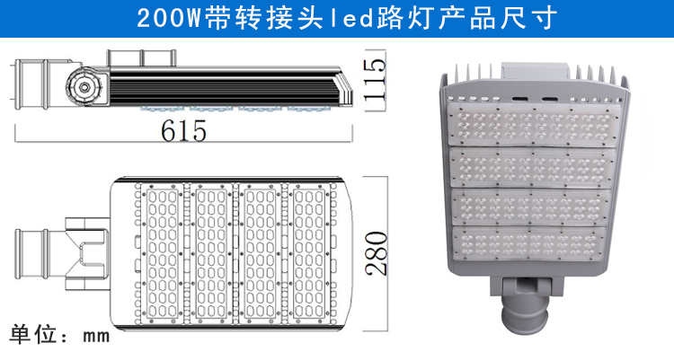 產(chǎn)品特點: 1.燈臂角度可180°調(diào)節(jié),照射角度可隨意變化 2.采用高亮度LED芯片,亮度高、顯色性好 3.鋁加工而成,對流散熱設計,散熱性能好,保障光源使用壽命 4.抗17級風力,無形變、松動等現(xiàn)象,異常牢固 5.防護等級IP65 適用范圍: 主干道路、高速公路、高架路、市區(qū)街道、天橋、人行道等道路照明,以及廣場、學校、住宅區(qū)、工業(yè)區(qū)、公園等其他需要戶外照明的場所。 產(chǎn)品規(guī)格(Product Spec):PL29L-200W LED路燈